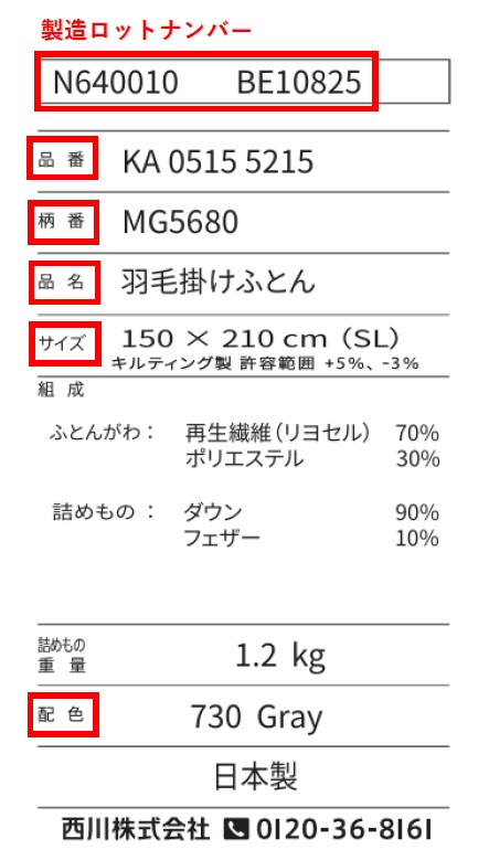 【NP7050 西川プレミアム 該当品番および製造ロットナンバー】