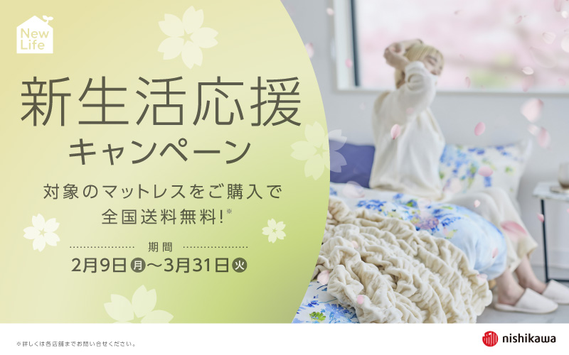- 2026年02月06日 10時 プレスリリース 新しい暮らしの始まりに、マットレスを送料無料でお届け!nishikawa『新生活応援キャンペーン』2月9日(月)から3月31日(火)まで開催いたします