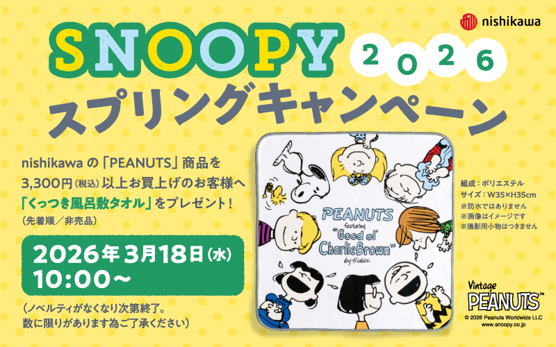 - 2026年03月11日 プレスリリース nishikawaが「スヌーピー 2026 スプリングキャンペーン」を開催!ペットボトルカバーやお弁当ポーチとしてマルチに使える「くっつき風呂敷タオル」をプレゼントいたします