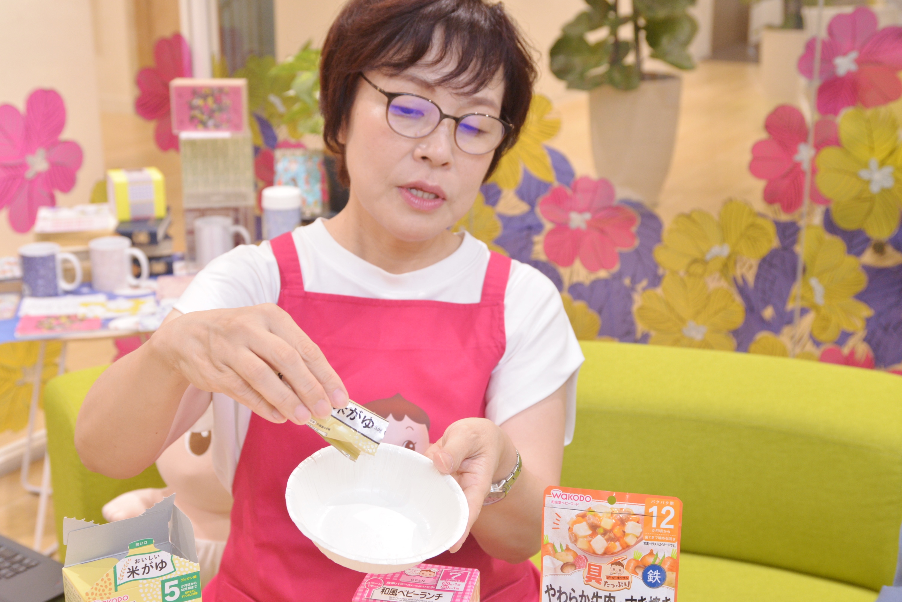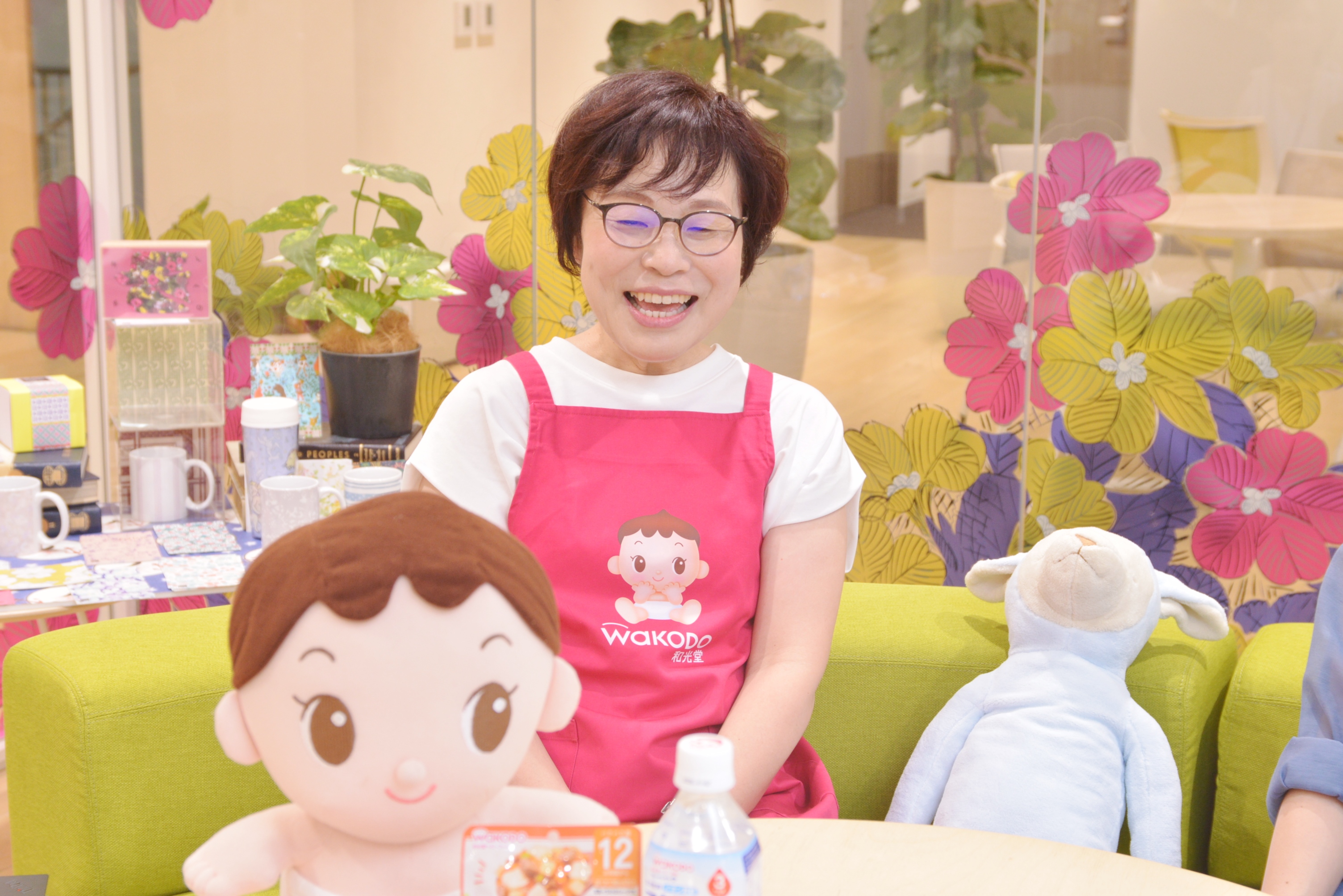 荻原さん。エプロンは講師などをする際のユニフォームで、和光堂の「わこちゃん」と一緒に
