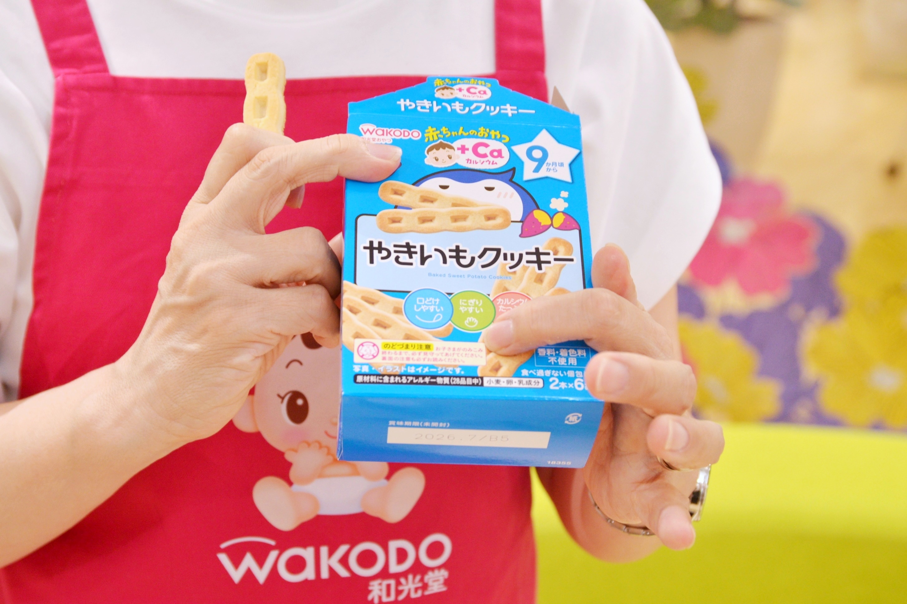 もうひとつは、おやつをご紹介します。1歳前後のお子さまが自分で食べる楽しさを体験してもらうために、「手づかみ食べ」をおすすめしています、その用途に適しているのがこの形。今日は9か月頃からの、やきいもクッキーをお持ちしました。口どけしやすく、甘さ控えめのほっこりした味も人気です。