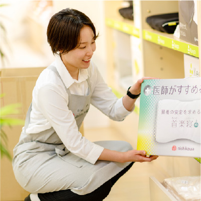 nishikawaに入るまで睡眠の質についてほとんど意識していませんでした。睡眠について学び、nishikawaの寝具を一式揃えて使ってみると、首が痛くない、朝までぐっすり、疲れが取れる! 寝具がこんなに体に影響を及ぼしているんだと実感しました。そんな実感もお客様にお伝えしています。お客様の「首が痛い」「腰が痛い」「熟睡できない」などのお悩みを一つひとつ解消し、喜ばれると、やってて良かった!と心から思います。