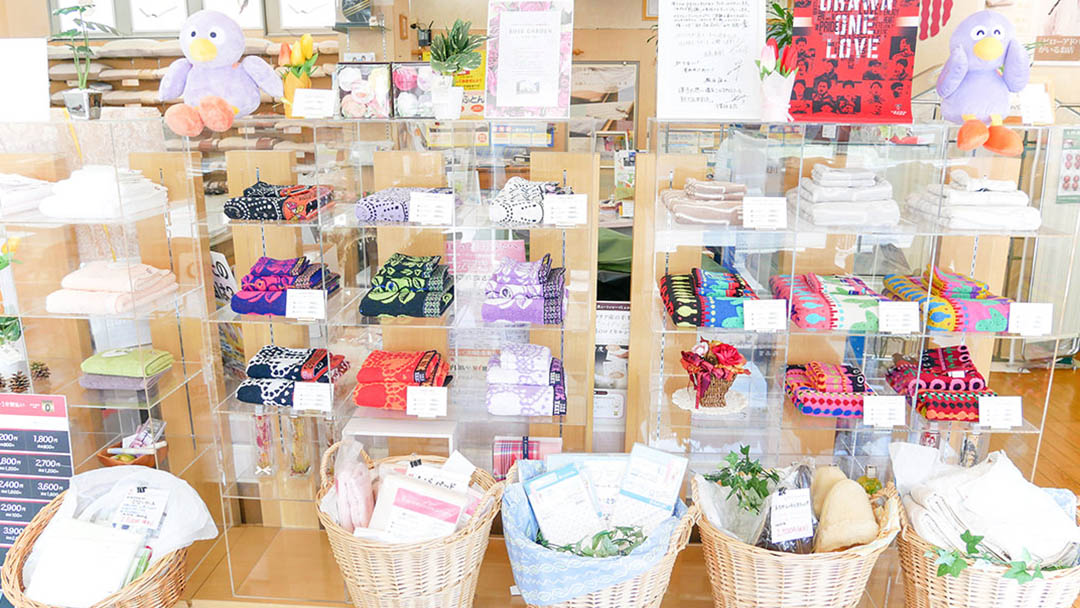 入ってすぐの場所には、生活雑貨のコーナーが。タオルはシンプルなものからカラフルな柄まで取り揃えてあり、ギフトにもおすすめです。西川の幅広いラインナップから厳選し、すっきりとオシャレに陳列されているので、お買い物気分が高まります!
