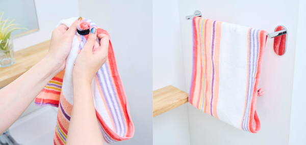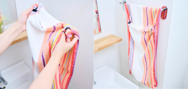 タオルの角をヘアゴムで結び、フックに掛けて完成!