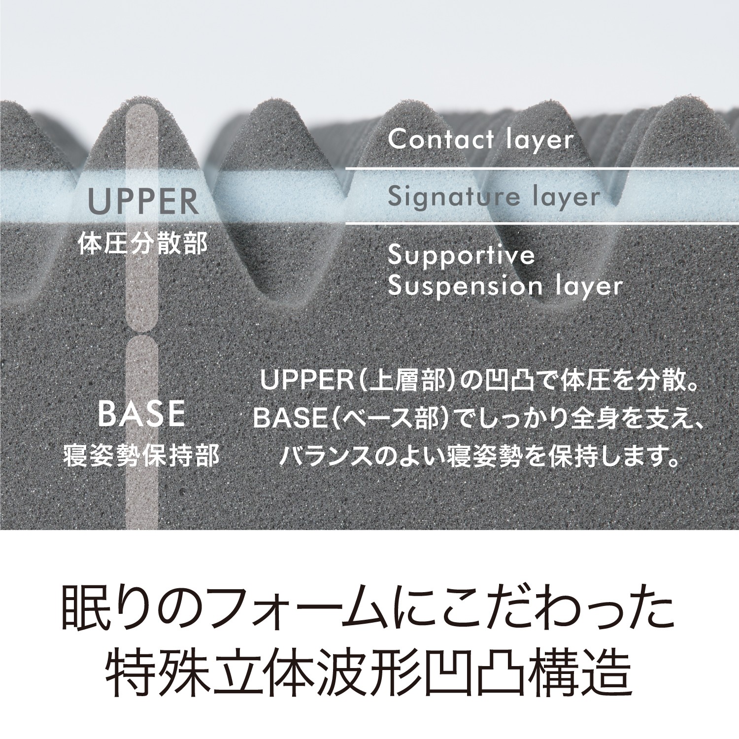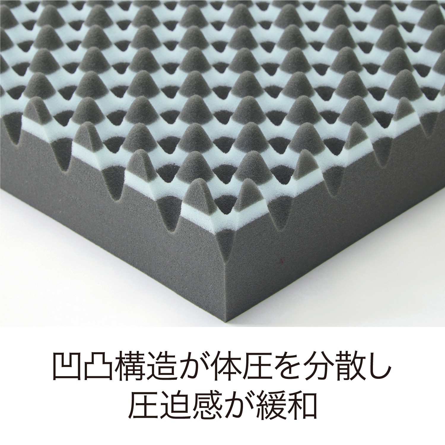 表面の凹凸構造が体圧を分散し、ベース部が体をしっかり支えます。圧迫感が緩和され、寝返りもスムーズに、リラックスしながら睡眠。気持ちの良い目覚めが得られます。