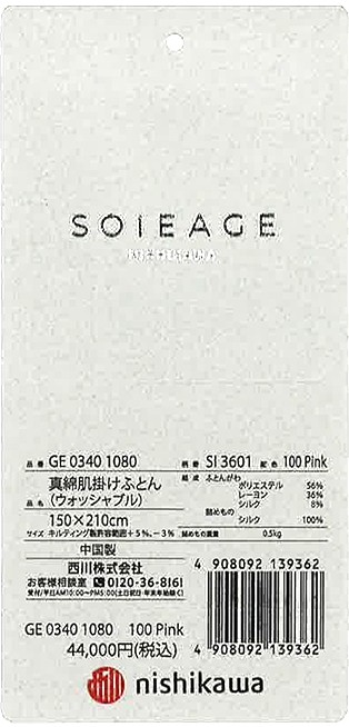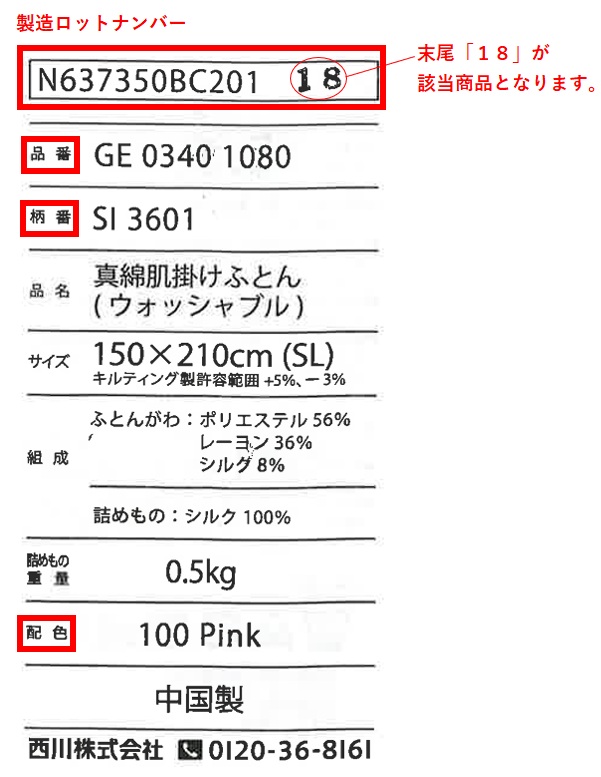 このたび、弊社商品『SI3601ソワージュ 真綿肌掛けふとん』の一部におきまして、側生地の組成混用率が不適合の商品が混入していたことが判明いたしました。