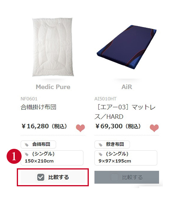 商品比較機能とは「お気に入り」に登録した商品の各種情報を比較できる機能です。比較できる商品は『掛け布団』や『マットレス』など同じカテゴリの商品です。